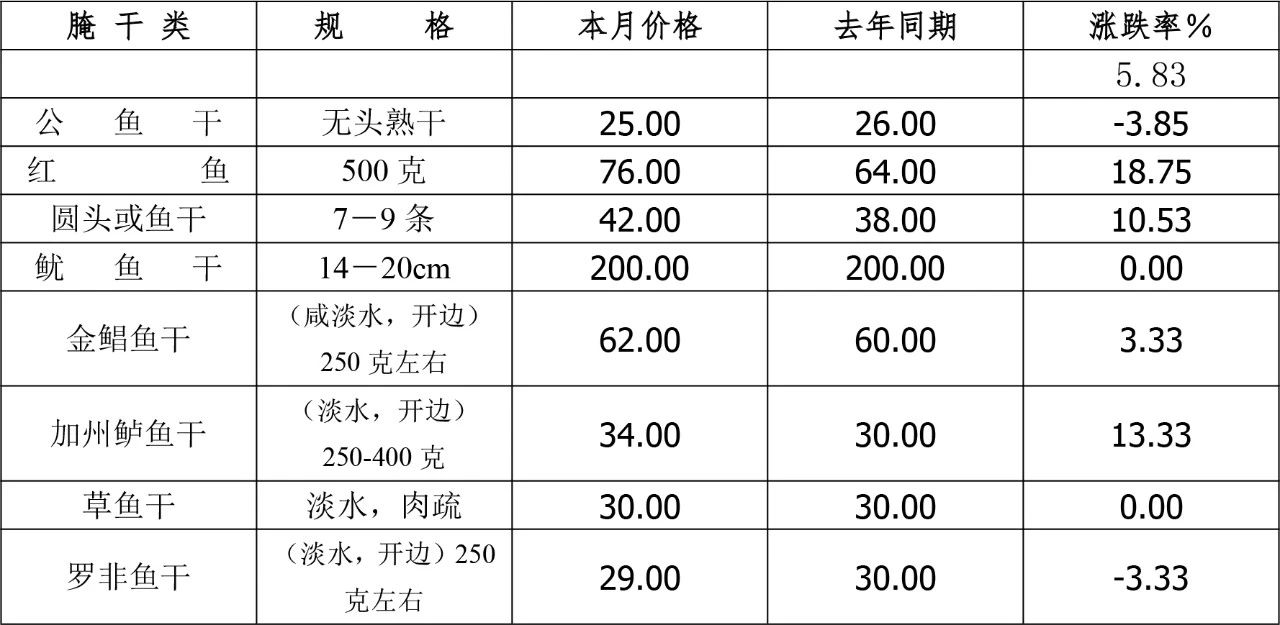 品种方面,公鱼干(无头熟干)为25.00元/1000克(以后均按1000克计),环比持平,同比降3.85%;红鱼(500克)为76.00元,环比持平,同比升18.75%;金鲳鱼干(咸淡水,开边,250克左右)为62.00元,环比持平、同比升3.33%;加州鲈鱼干(淡水、开边,250-400克)为34.00元,环比持平,同比升13.33%。(表11、12)