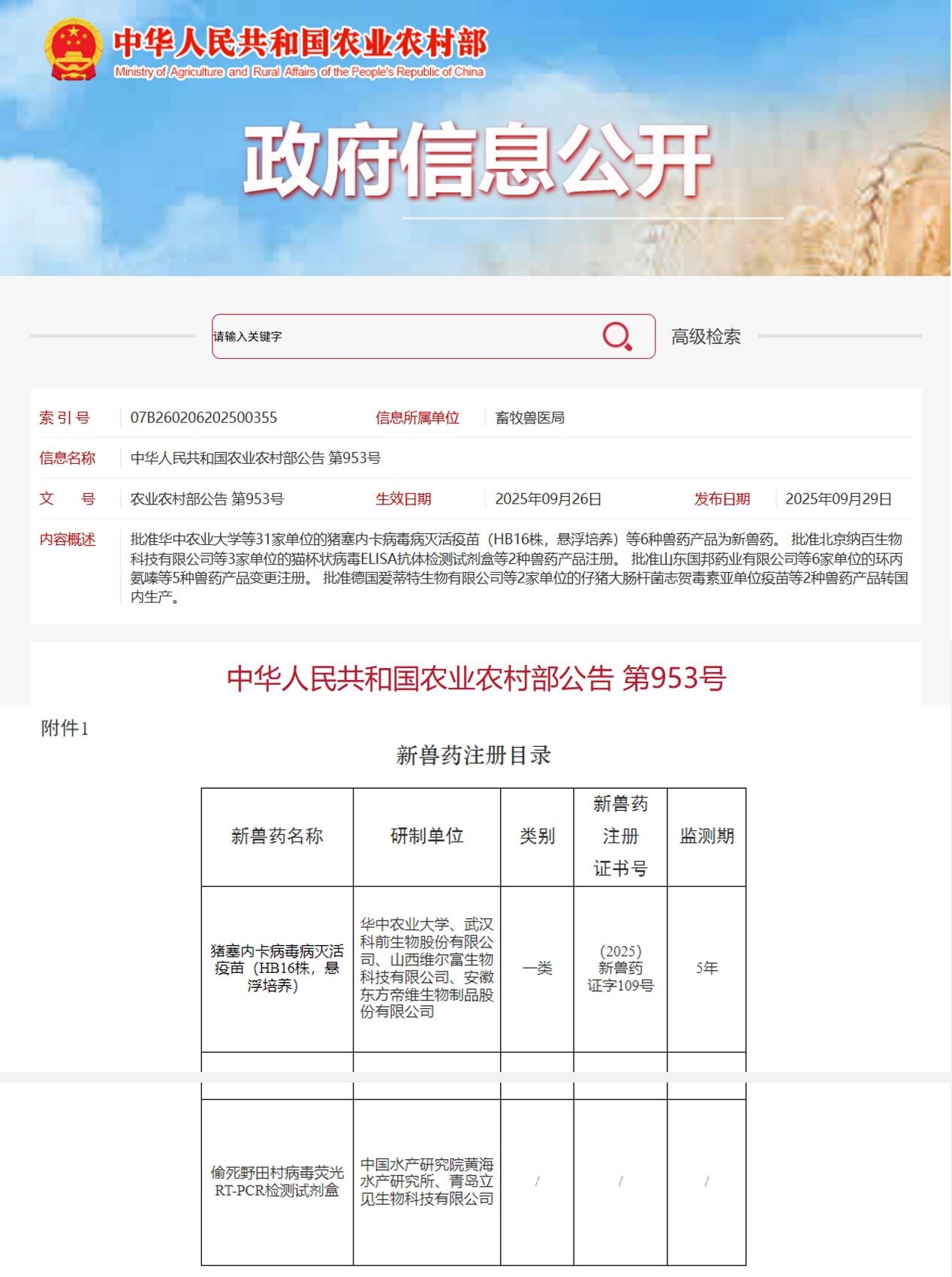 近日,农业农村部发布第953号公告,根据《兽药管理条例》和《兽药注册办法》规定,经审查,中国水产科学研究院黄海水产研究所与青岛立见生物科技有限公司联合研制的“偷死野田村病毒荧光RT-PCR检测试剂盒”获批兽药产品注册。公告同步发布了产品质量标准、工艺规程、说明书和标签,自发布之日起正式执行。