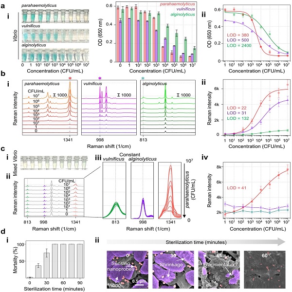基于ES-AuAgNPs的多功能特性,研究团队构建了水产养殖弧菌“筛—鉴—灭”一体化平台。集成平台利用材料的类过氧化物酶活性,将目标弧菌捕获后,2分钟内即可让溶液呈现肉眼可见的颜色变化(阴性为蓝色,阳性为无色)。这一速度使养殖户能在鱼苗发病初期锁定风险池,为后续处置争取关键时间。若初筛呈阳性,平台直接启动SERS鉴定流程,能同步区分三种高危弧菌,检测灵敏度低至50CFU/mL。这一指标接近PCR检测金标准,远超胶体金试纸条,为靶向防控提供精准依据,避免盲目使用抗生素。鉴定完成后,无需样品转移或额外操作,平台能够激活ES-AuAgNPs的杀菌性能,45分钟内实现100%灭菌效率,杜绝检测后污染扩散的风险。