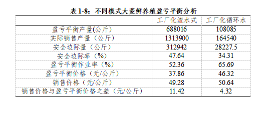 分不同模式来看,工厂化流水和循环水的盈亏平衡作业率分别为52.36%和65.69%,工厂化循环水的盈亏平衡作业率较高,同时其安全边际率较低,因此工厂化循环水的风险相对较高(表1-8)。
