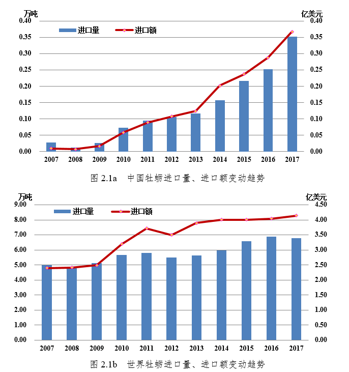 作为世界上最大的牡蛎生产国,中国每年从国外进口的牡蛎数量和金额虽然都不大,但除2008年外,其他年份均呈递增且最后4年增幅明显加大的态势,两者分别从2007年的276吨和95万美元,飙升至2017年的3519吨和3671万美元(图2.1a),年均增长率分别高达28.99%和44.13%。这或许会令人惊讶,但其原因却不难理解——伴随着持续多年的经济增长,中国社会涌现出一些对“奢侈品”消费有着特殊偏好的人群,国产牡蛎无法满足其对所谓“高端海鲜”的需求。这一现象近年来已经引起了国内牡蛎产业的重视并采取了相应的举措,例如,加大包括单体和三倍体牡蛎在内的牡蛎新品种选育及其苗种培育和养殖技术研发和推广力度。