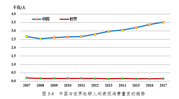 同一时期,按表观消费量计算的中国和世界牡蛎人均消费量则分别从期初的2.66kg/人和0.19kg/人,增加和下降到期末的3.52kg/人和0.15kg/人,年均增长率分别为2.82%和-2.47%(图3.4)。