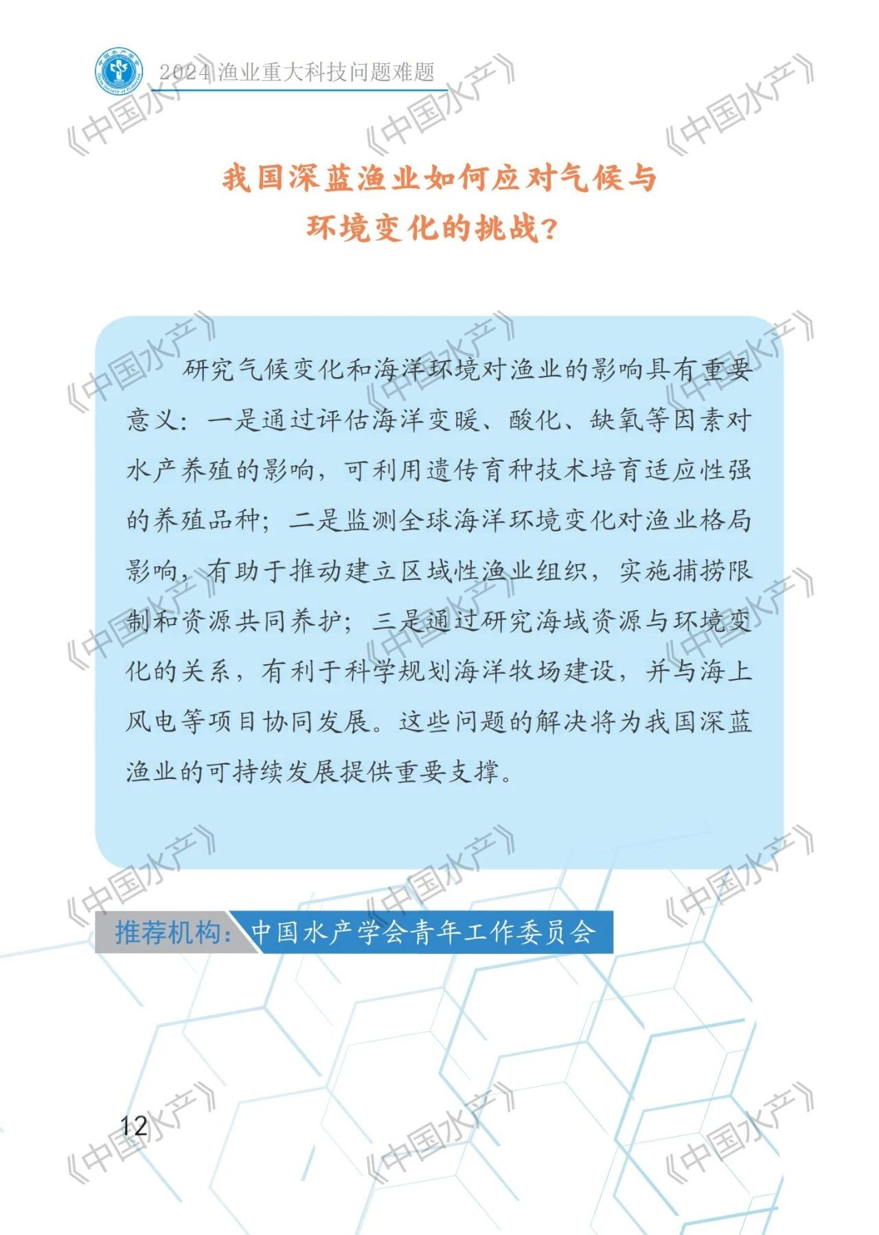 为进一步加强科技前瞻研判,引领原创性科研攻关,团结科技力量协同攻关,推动实现渔业科技高水平自立自强。中国水产学会组织动员学会所属各分支机构、省级学会、科研院校,面向国内外科技工作者,征集共同关注的水产前沿科技问题难题。经多位院士专家严格把关,突出前沿性、引领性、创新性、战略性,坚持向人才、科技、创新要新质生产力,要核心竞争力。共遴出12项2024渔业重大科技问题难题。名单如下: